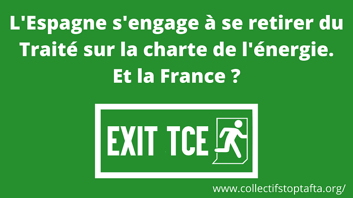 Cette annonce de l’Espagne intervient alors qu’une campagne européenne d’interpellation des gouvernements des différents États-membres a débuté cette semaine (https://s.42l.fr/Exit-TCE-Maintenant) : les citoyennes et citoyens sont invités à écrire à leurs ministres respectifs pour exiger que les États de l’UE « se retirent du Traité sur la Charte de l’énergie » et « votent contre le projet de nouveau TCE lors du prochain vote du Conseil des ministres de l’UE ». Cette campagne est relayée par des activistes du climat telles que Greta Thunberg, ou Camille Etienne pour la France. Il est temps qu’Emmanuel Macron et le gouvernement d’Elisabeth Borne s’engagent fermement en ce sens.